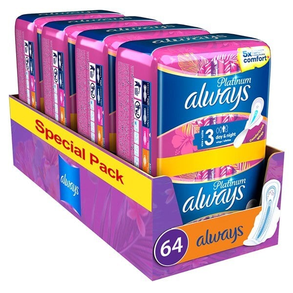 ALWAYS Ultra Platinum Νight Σερβιέτες με Φτερά για Κανονική Ροή Μέγεθος 3 64 Τεμάχια