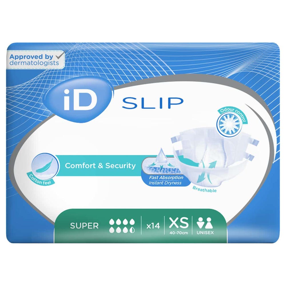 ID Slip Super XS — Πάνα ενηλίκων ανοιχτού τύπου, μέγεθος XS (40-70cm). Απορροφητικότητα Extra Plus (6/9 σταγόνες, 1.550ml ISO). Συσκευασία: 14 τεμάχια ανά πακέτο × 12 πακέτα ανά κιβώτιο (168 τεμάχια/κιβώτιο).